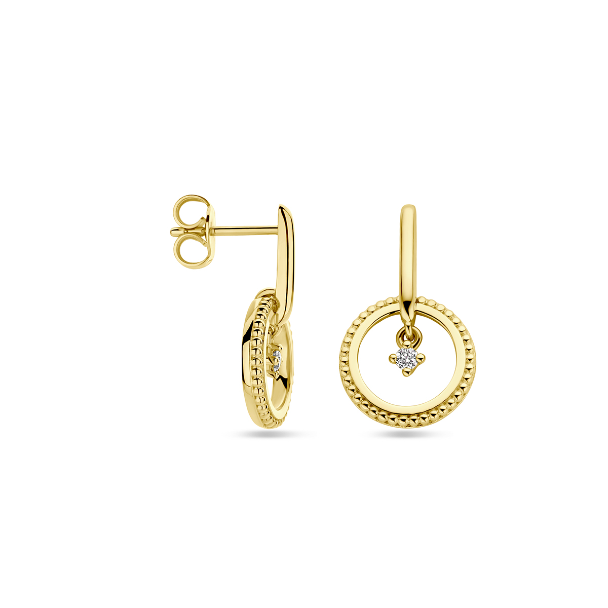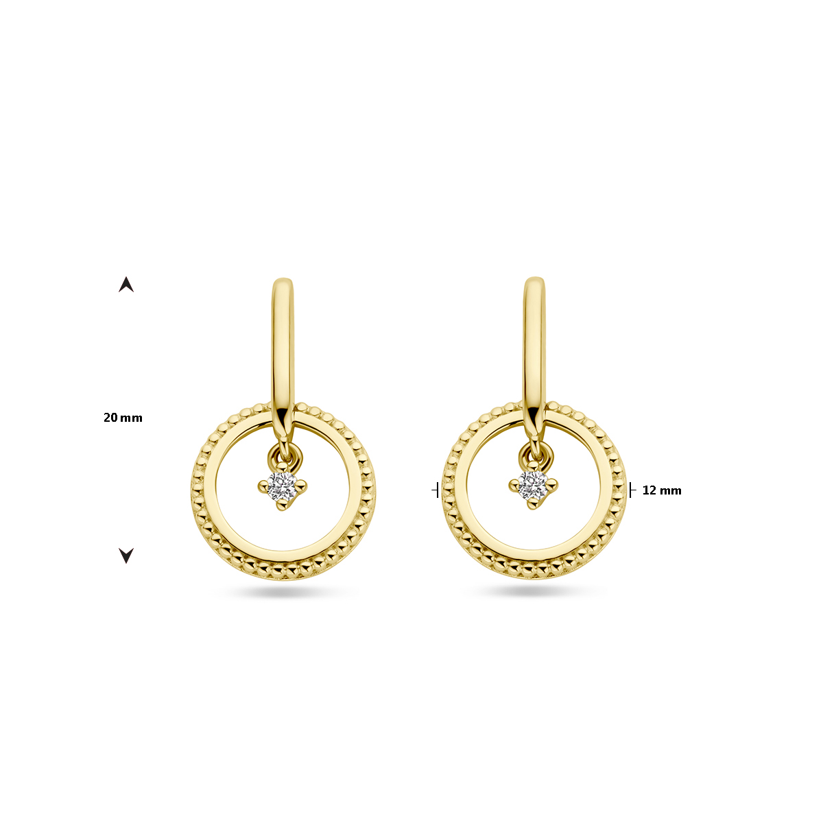 Oorhangers cirkel diamant 0.06ct hebben een elegante ronde vorm en zijn gemaakt van goud. Ze bevatten briljante SI2 diamanten van 0.06ct (2x 0.03ct). Deze goudkleurige oorknoppen met een glanzende afwerking wegen 3.2 gram. Draag ze dagelijks of bij speciale gelegenheden voor een tijdloze en verfijnde look. Perfect als luxe aanvulling op elke outfit.