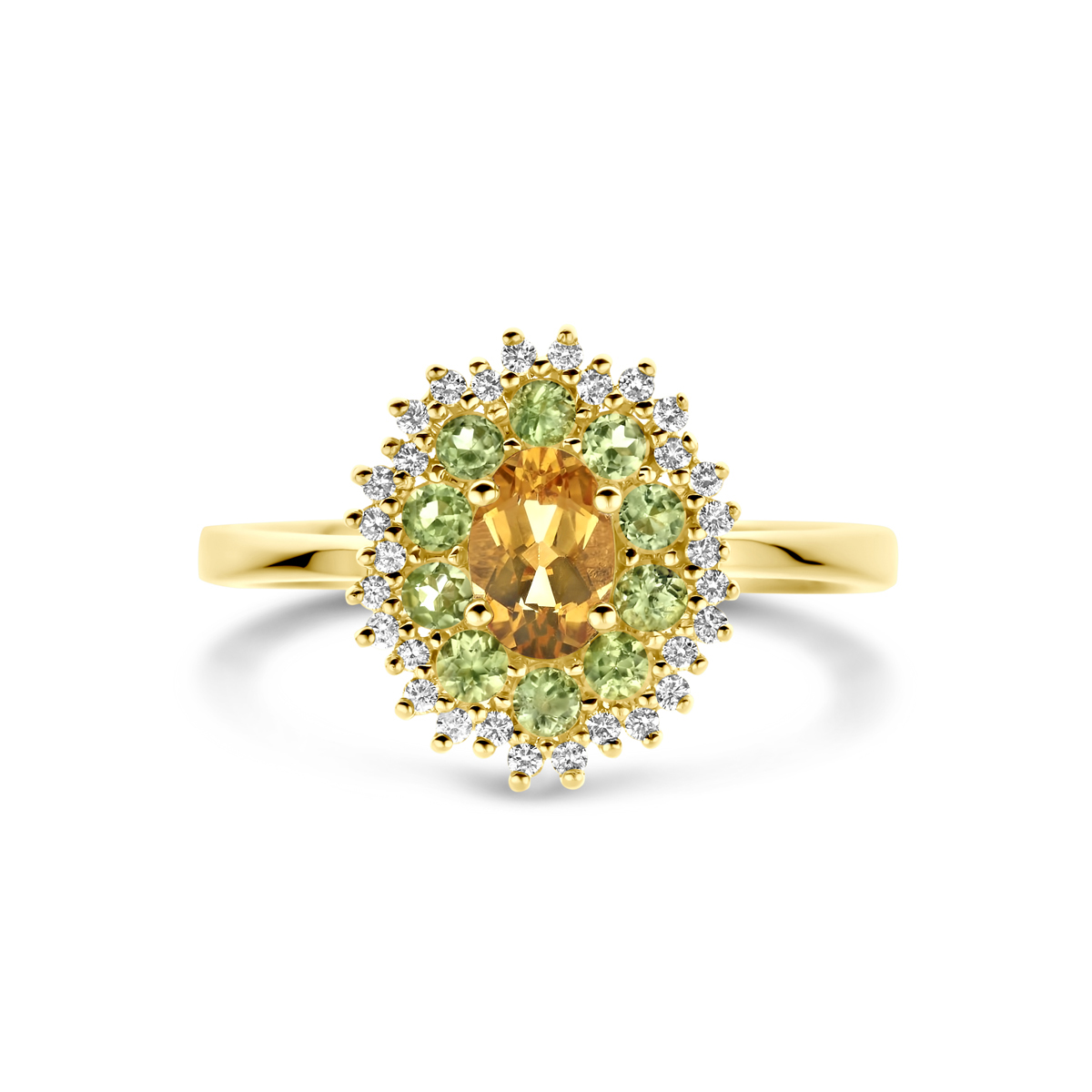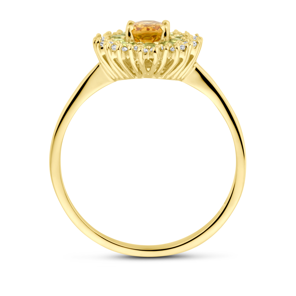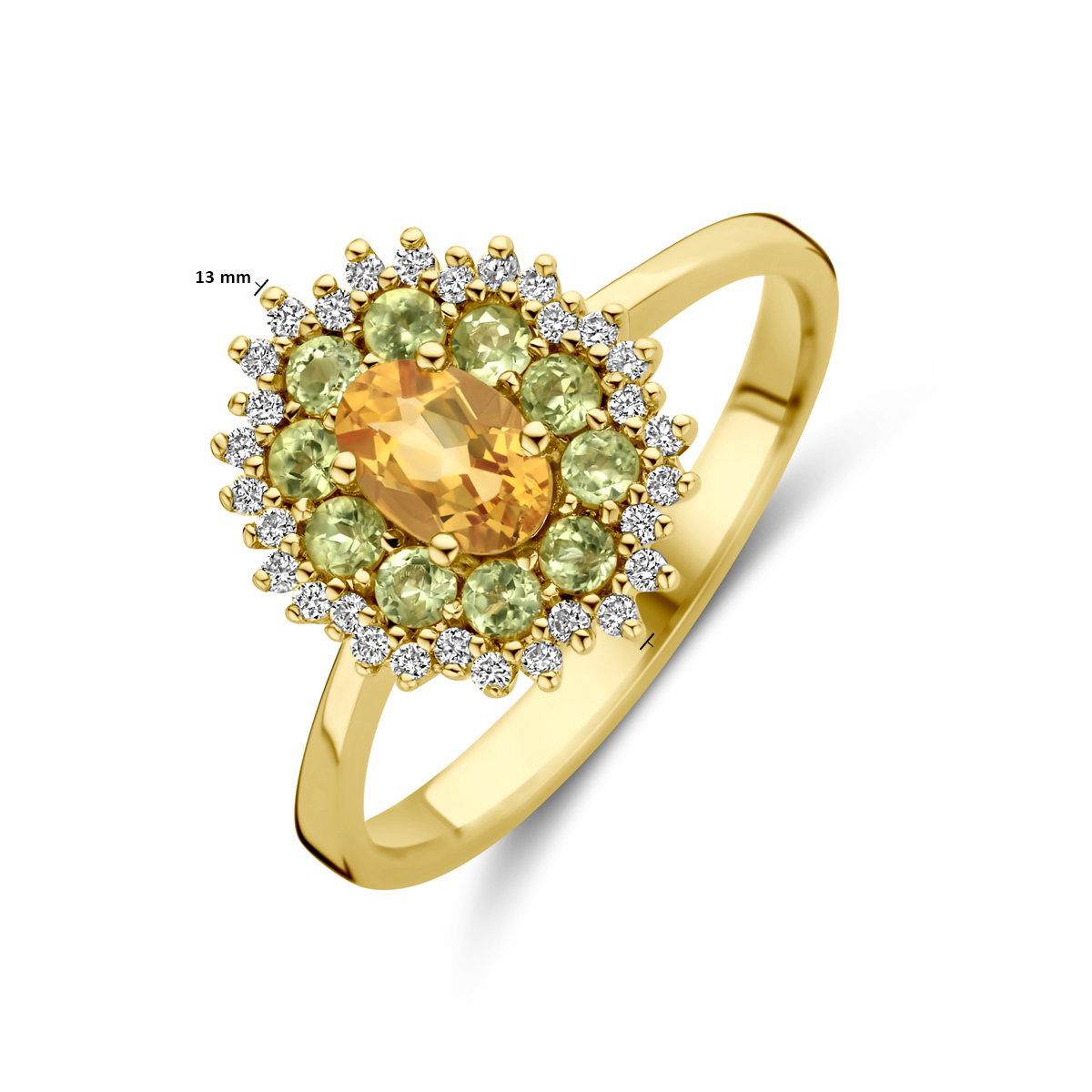 De 14-karaats goudring met citrien, peridot en diamant (0,15ct G SI) biedt een prachtige combinatie van luxe en elegantie. Deze ring heeft een ovale citrien als blikvanger. Perfect voor maat 52 met een breedte van 13mm. Draag het als een statementstuk om elke outfit te verfraaien. Voeg flair toe aan dagelijkse en speciale gelegenheden.