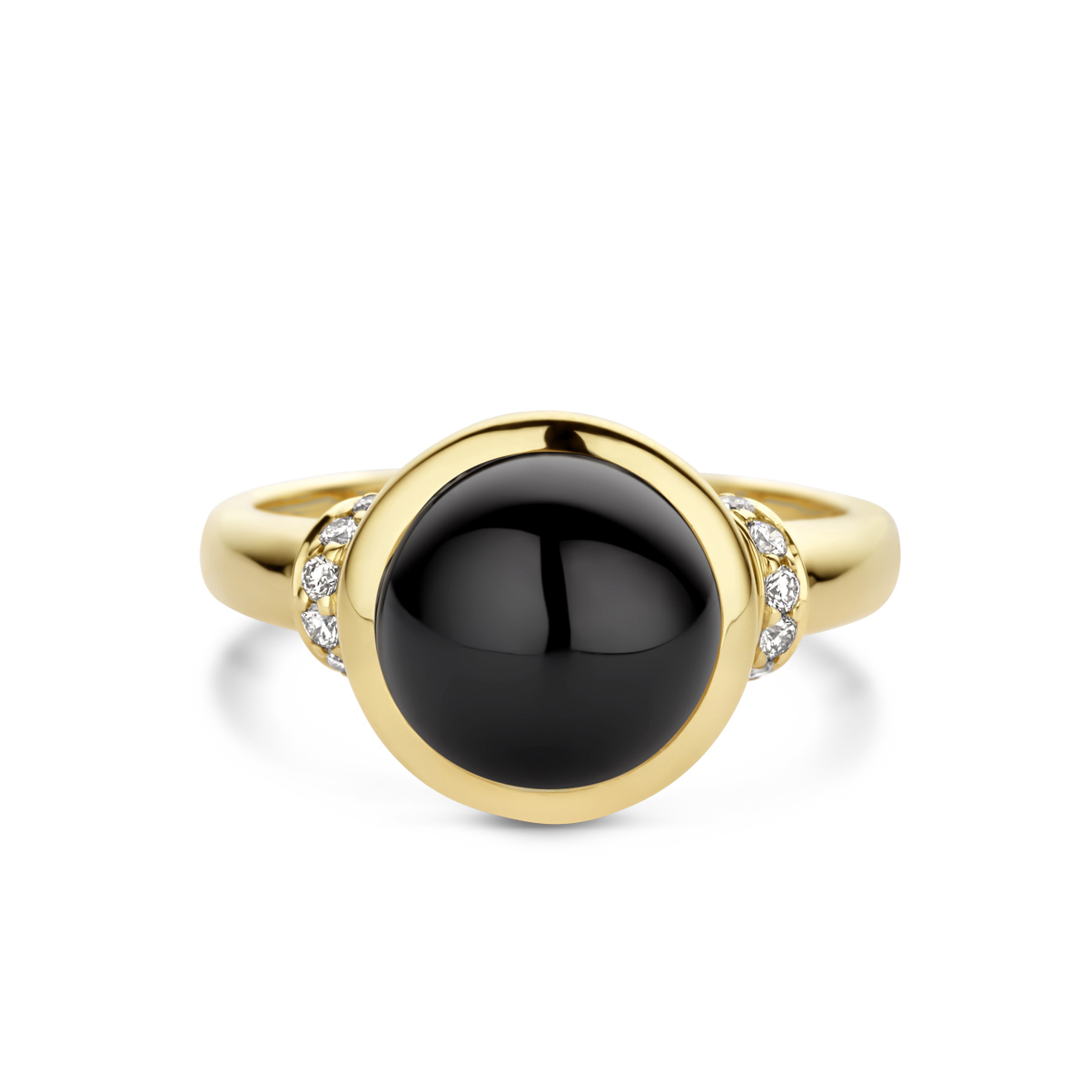 Product 14 Karaats Ring onyx en diamant 0.08ct h si bevat: gouden ring, 11.5mm breed, glanzend, ronde vorm, maat 56, diamant 0.08ct h si briljant geslepen witte diamant van 0.08ct SI1. Draag deze elegante ring solo of combineer met andere sieraden voor een verfijnde uitstraling. Perfect voor dagelijks gebruik of speciale gelegenheden.