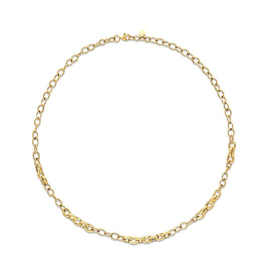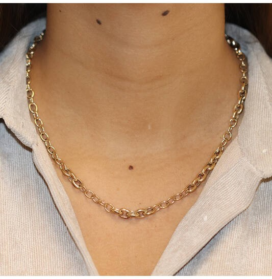 Dit 14 karaats schakencollier onderdeel van de Van Zaanen Goud Collectie, heeft een unieke fantasieschakelontwerp en is 45 cm lang. Draag het als een opvallend sieraad, zowel solo als in combinatie met andere kettingen. Het is een verfijnde aanvulling voor elke outfit en gelegenheid.