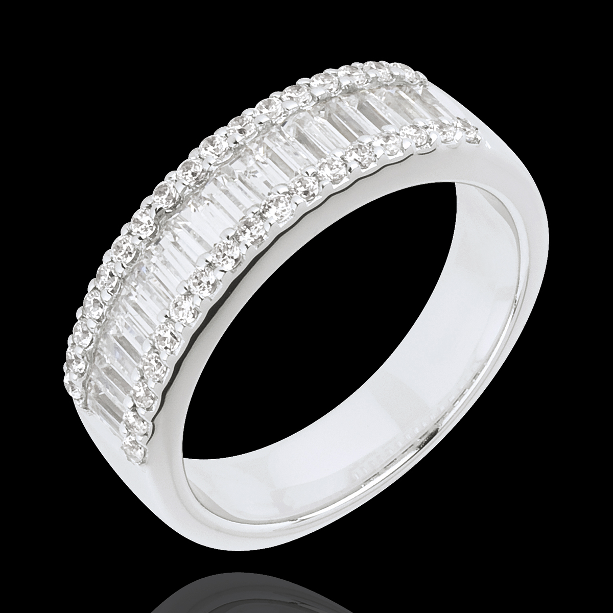 Deze ring uit onze collectie toont drie rijen briljanten en baguette diamanten voor een gestructureerd en verfijnd multi-steen effect.