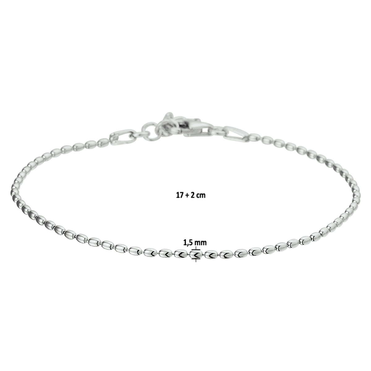 Gerhodineerd zilveren 1.5mm bolletjes armband met een lengte van 17cm met een extensie van 2cm. De armband is uitgevoerd met een stevige karabijn sluiting en is te combineren met bijpassende sieraden uit onze collectie.