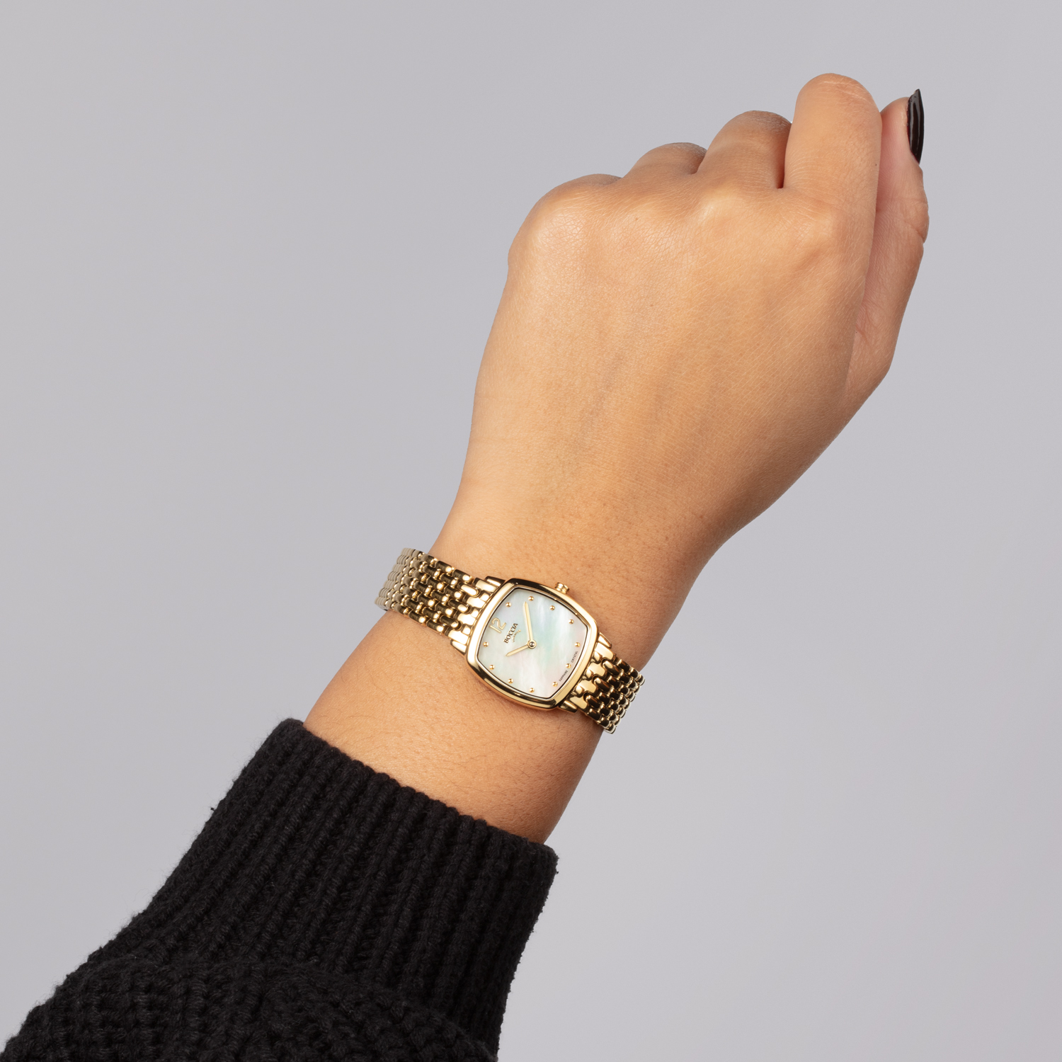 Dit dameshorloge van Boccia heeft een klassieke uitstraling en een chique uiterlijk. De 3353-02 heeft een vierkante goudkleurige titanium horlogekast met een diameter van 25mm met een parelmoer wijzerplaat. Aan de titanium kast zit een goudkleurige titanium schakelband met vouwsluiting. Het horloge heeft een saffierglas en is 5ATM. Of je nu sportief of chique gekleed gaat, dit horloge past bij elke outfit en iedere gelegenheid!