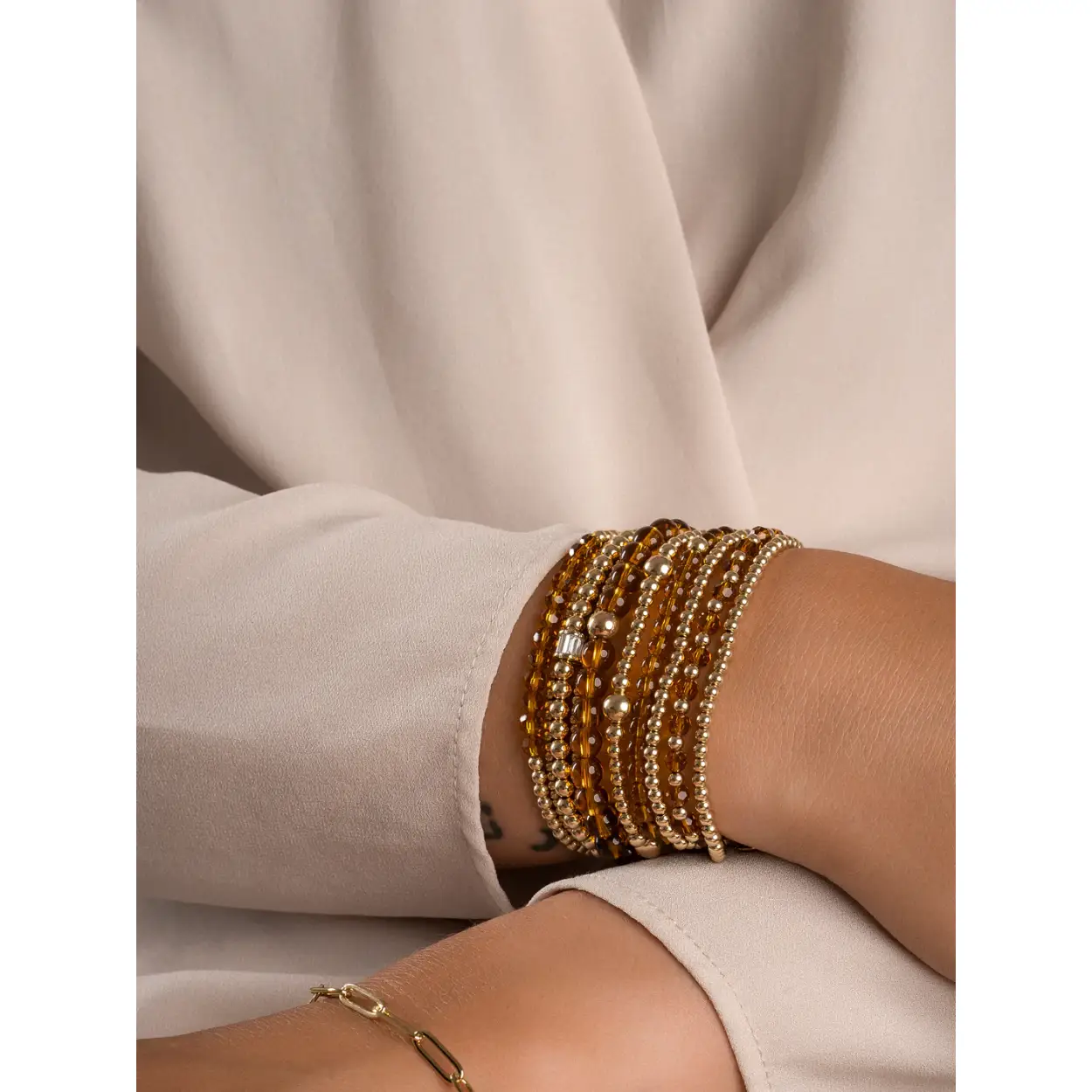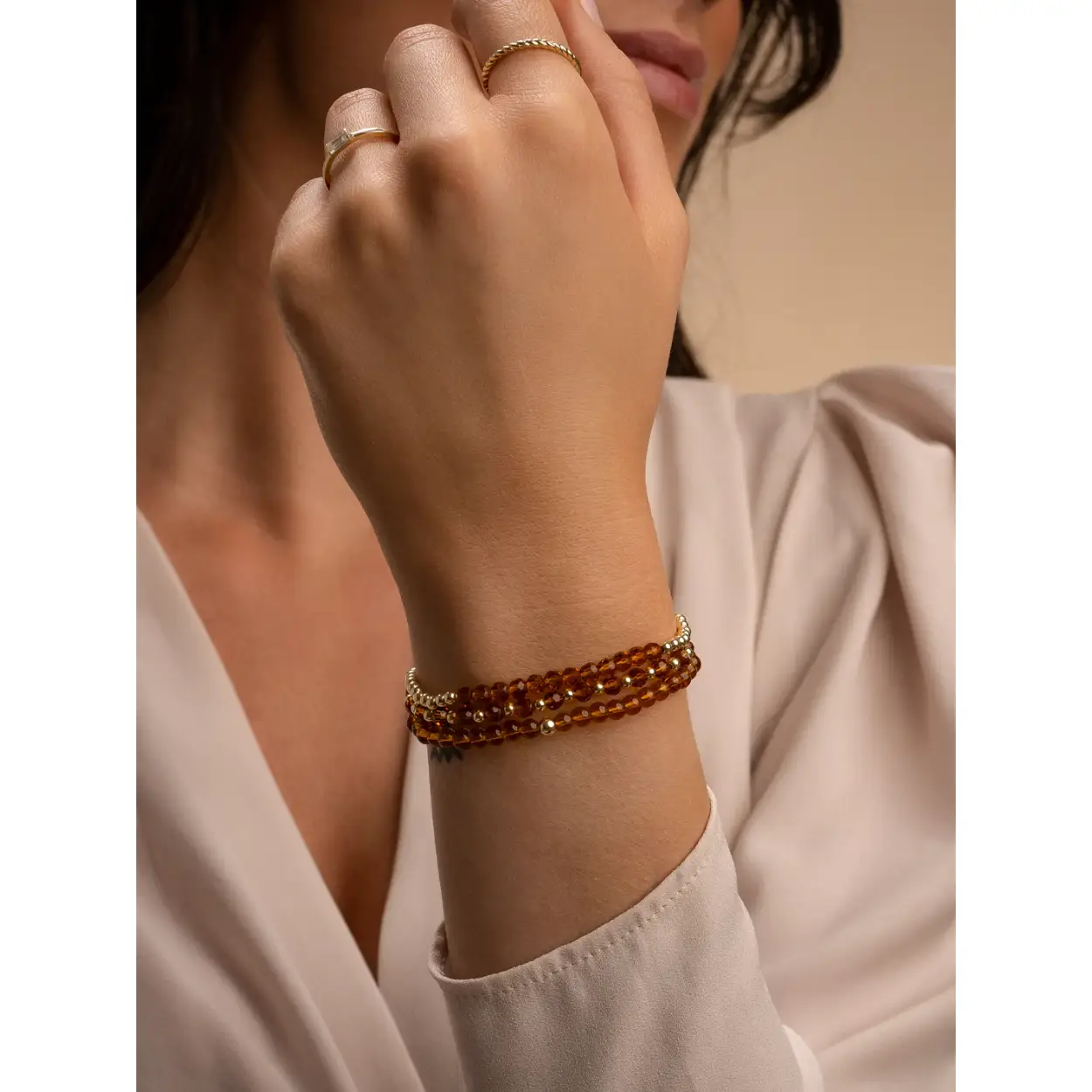 Armband - Citrien Quartz Universum - Goud 3mm. Als je op zoek bent naar een mooie finish voor je look, zoek dan niet verder. De Citrine Quartz Universe armband zit comfortabel om je pols en je kan he zowel alleen als in combinatie met de andere kralen armbanden dragen.