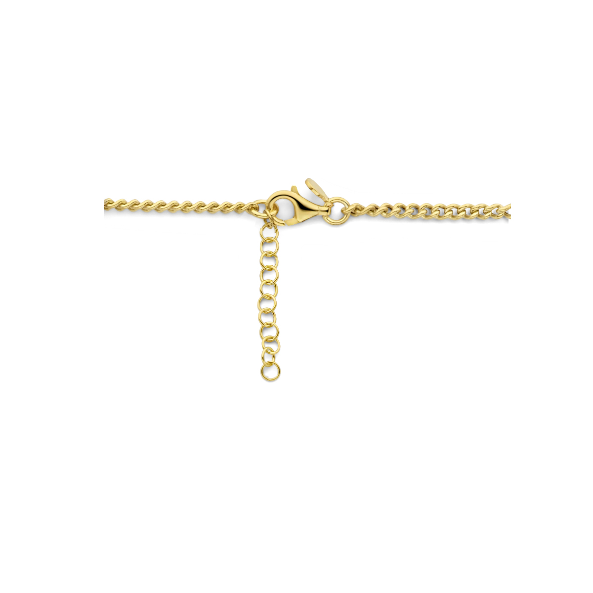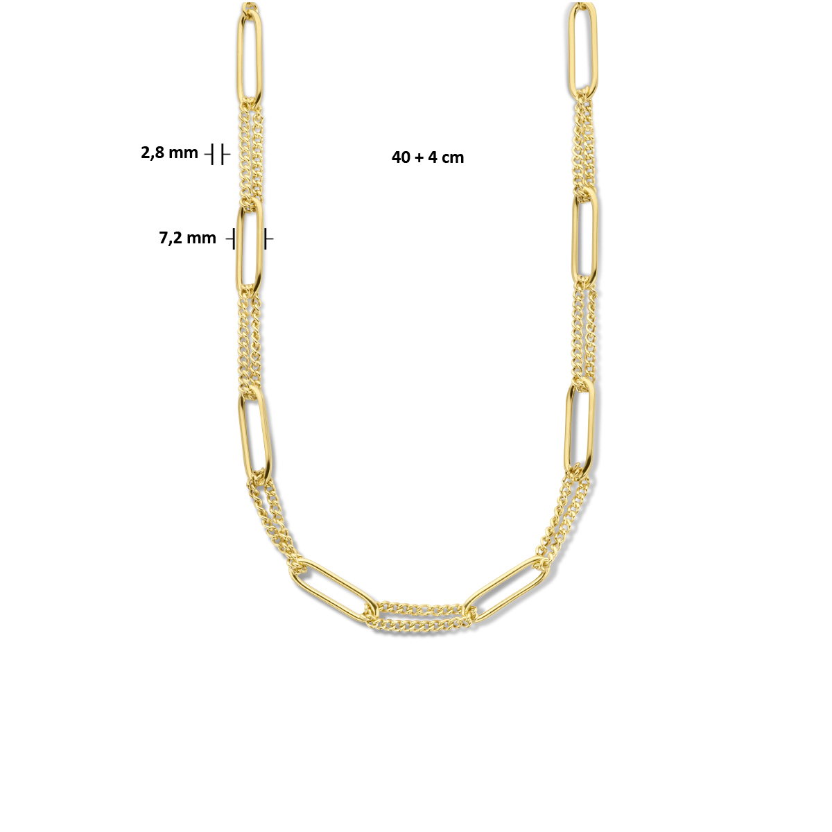 Geelgoud op 925 zilveren collier uitgevoerd met een paperclip schakel van 7.2mm, gourmette schakel van 2.8mm en een karabijn sluiting. Het collier heeft een draaglengte van 42cm en een extensie van 3cm. Geen garantie op de plating.