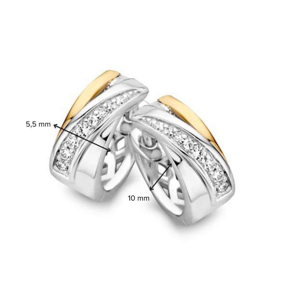 Deze prachtige oorringen zijn van zilver gecombineerd met 14 karaats goud en een witte zirkonia steentjes. Ze hebben een scharniersluiting en een glanzende afwerking. Draag ze bij zowel casual als formele outfits voor een elegante uitstraling. Perfect als aanvulling op zowel dagelijkse kleding als feestelijke gelegenheden.