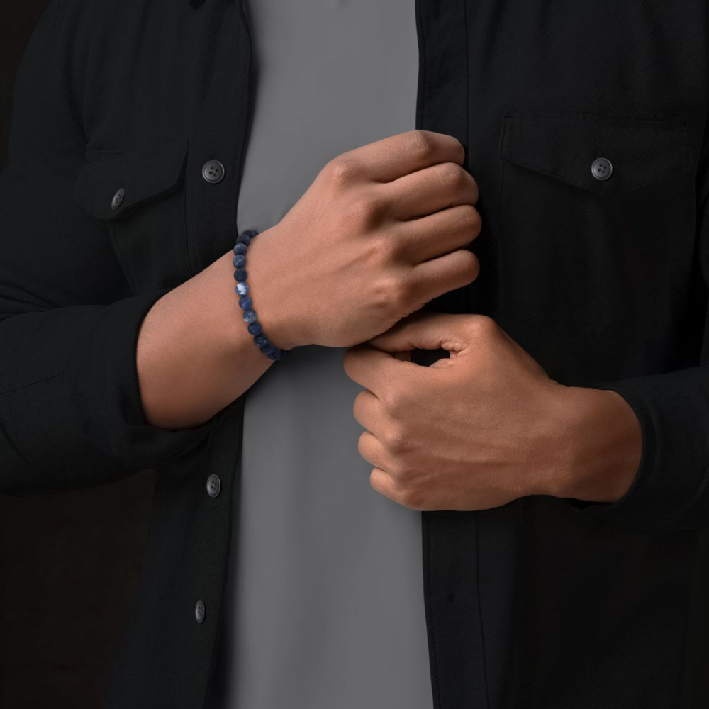 Edelstenen bead armband, handgemaakt van 8mm mat blauwe Sodaliet met een zilverkleurige sluiting. Het Rebel & Rose sieraad is makkelijk te combineren met andere zilveren, leren of kralenarmbanden.