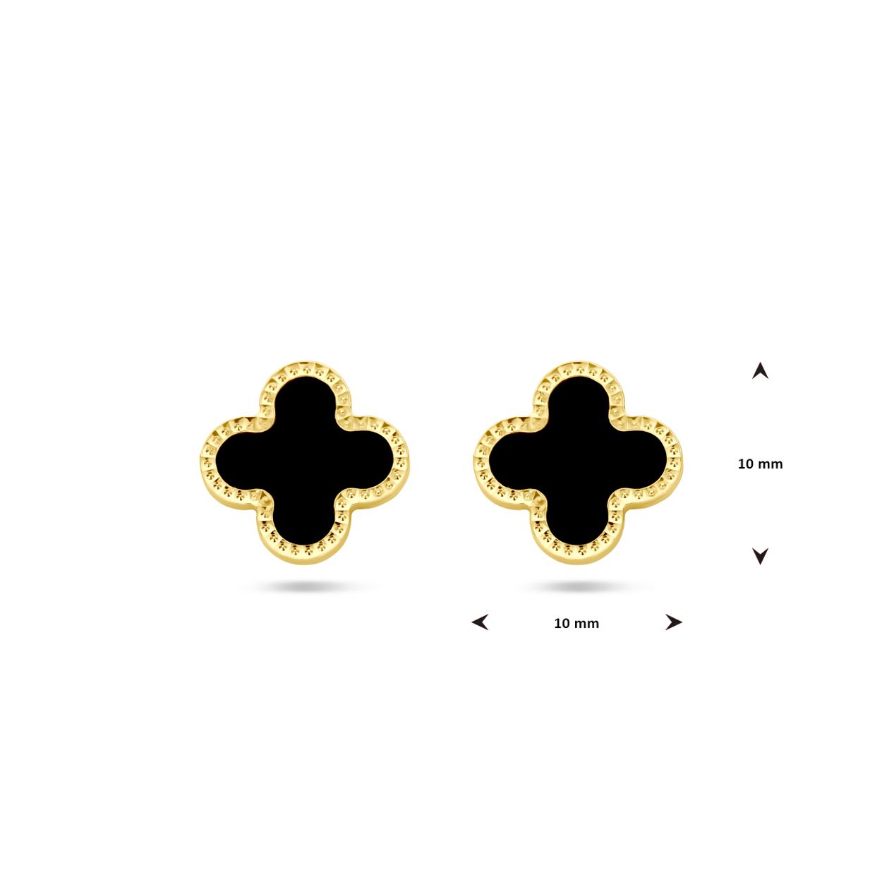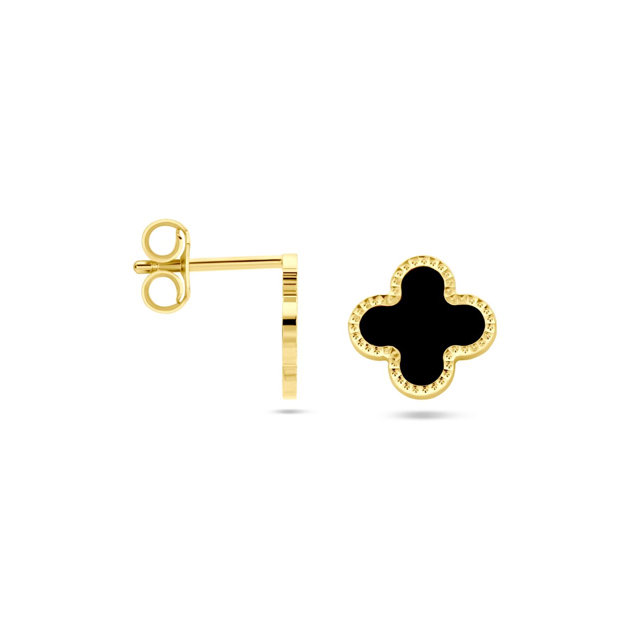 14k Geelgouden oorknoppen uitgevoerd met een bloem en onyx. De oorknoppen hebben een afmeting van 10x10mm.