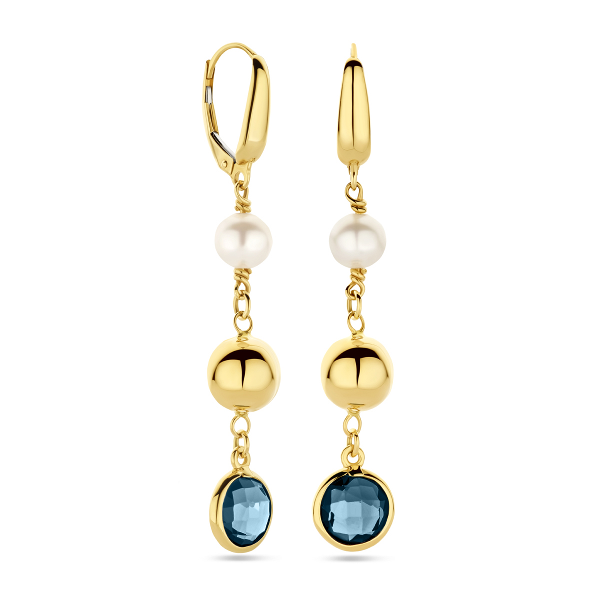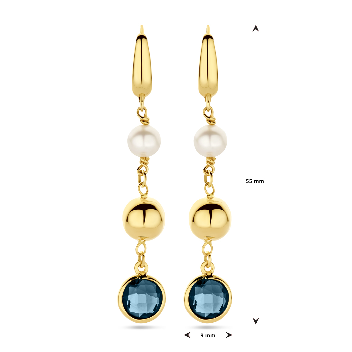 14k Geelgouden oorringen uitgevoerd met parels en london blue topaas. De oorringen hebben een totale hoogte van 55mm.