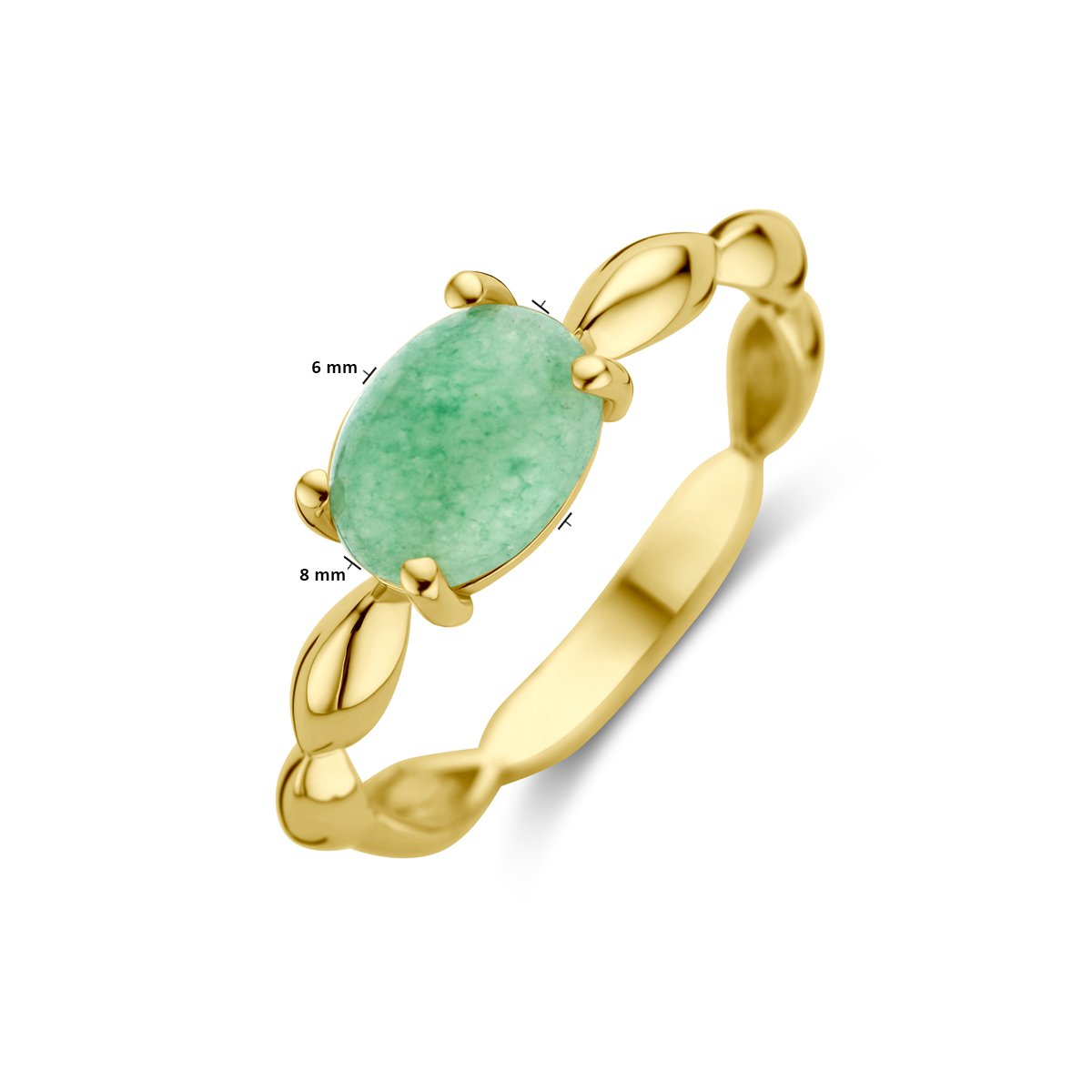 14k Geelgouden ring uitgevoerd met groen agaat. De steen heeft een afmeting van 8x6mm.