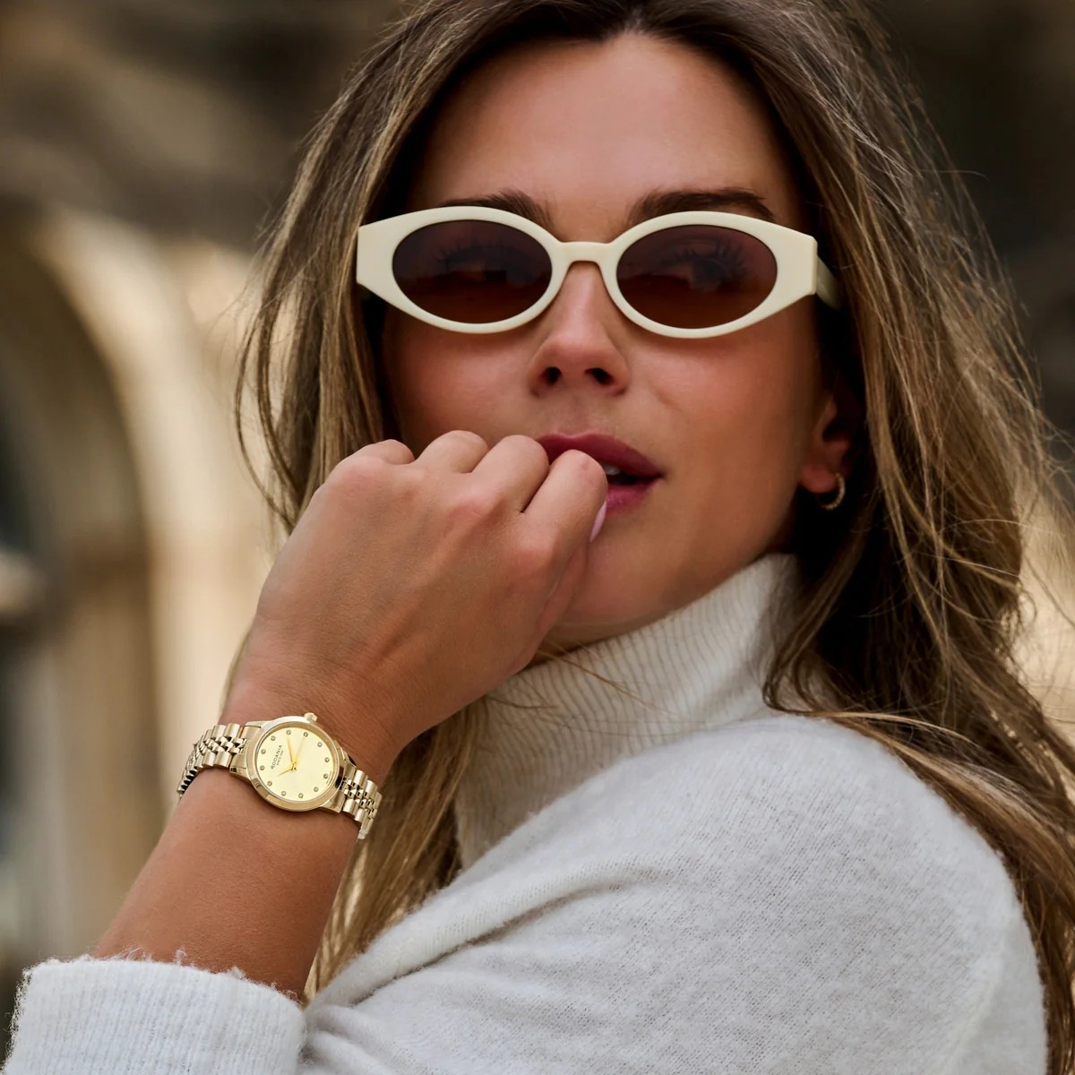 De Rodania Dameshorloge MONTREUX - R10010 is een verfijnd dameshorloge met een roestvrijstalen kast en een goudkleurige band. Zonder datumaanduiding, straalt deze polshorloge elegantie en eenvoud uit. Ideaal te dragen bij zowel formele als informele gelegenheden voor een klassieke, stijlvolle uitstraling. Perfect te combineren met gouden sieraden voor een harmonieuze look.