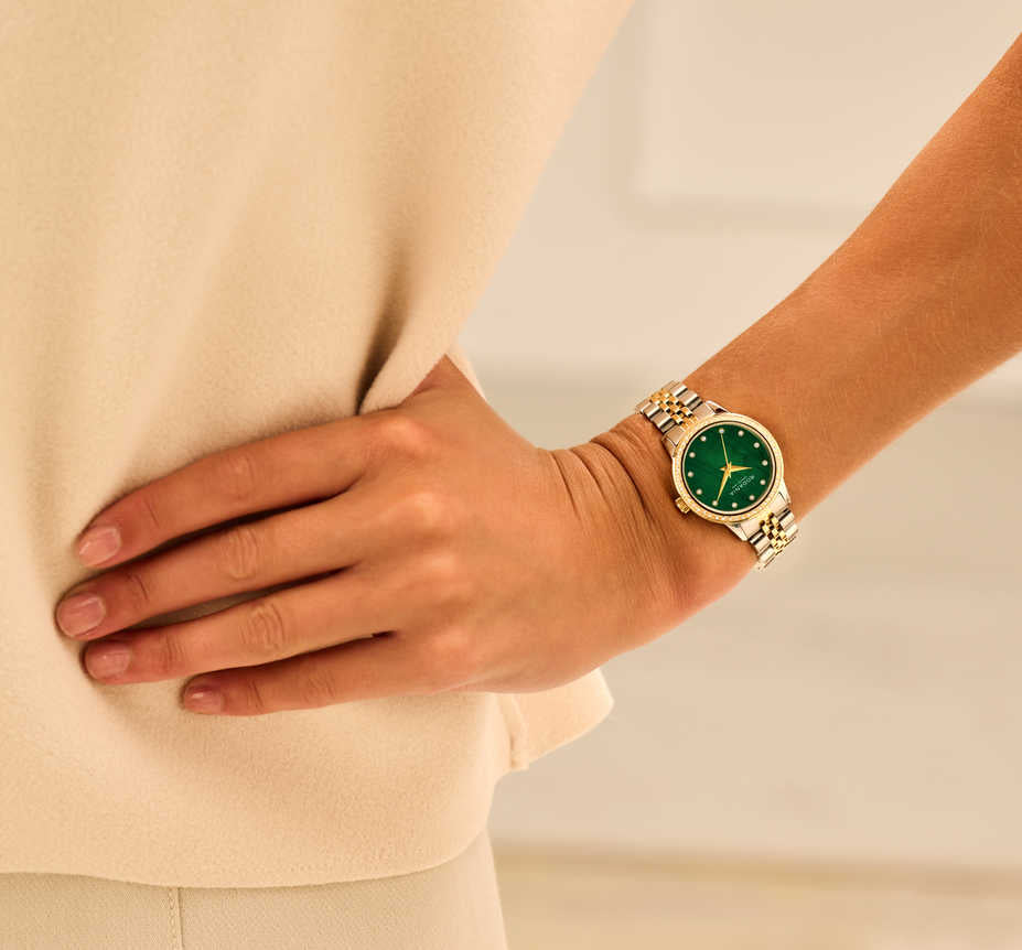 De Rodania Dameshorloge - R10025 Montreux is een stijlvolle polshorloge met een groene wijzerplaat en sierdiamanten. De gouden en zilvergekleurde band geeft een luxe uitstraling. Het horloge is waterbestendig tot niveau 5. Draag het bij zowel casual als formele gelegenheden om een elegante en verfijnde look te creëren.