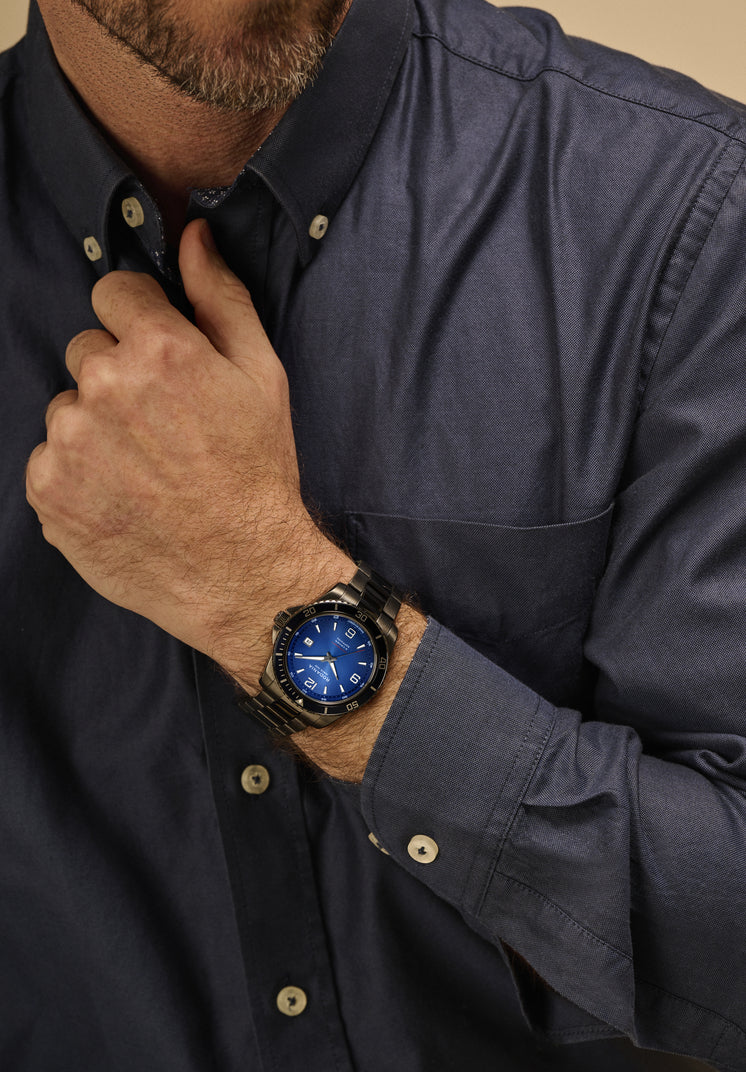 De Rodania Herenhorloge R18049 biedt onder andere een roestvrijstalen kast van 43 mm, saffierglas, een blauwe wijzerplaat met streepjesindex en een analoge kwartsbeweging. Het horloge is waterdicht tot 200 meter en heeft een roestvrijstalen band. Draag het dagelijks of bij het duiken, maar vermijd allergieën. Perfect voor zowel casual als formele gelegenheden.