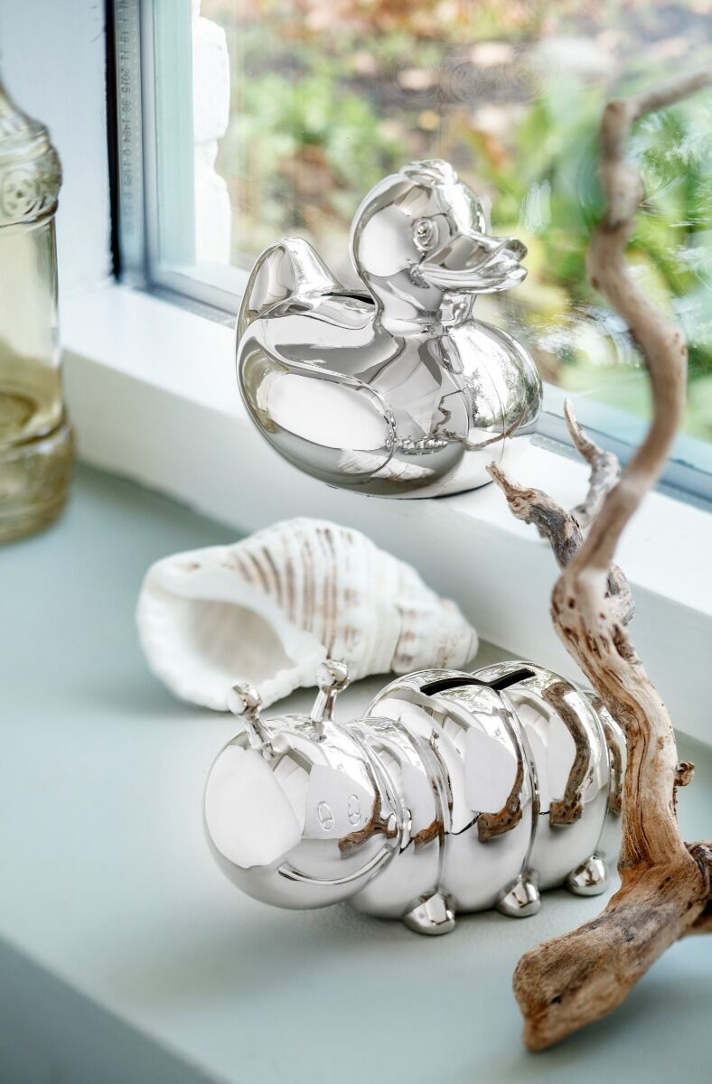 Spaarpot van een eend. De spaarpot is in zilver kleur en poetsen is overbodig. De spaarpot kan gegraveerd worden, wat het een persoonlijk (geboorte)cadeau maakt.