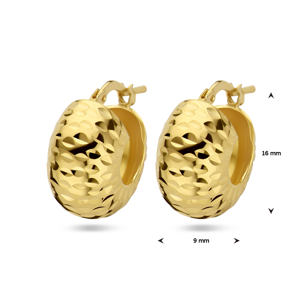 Vergulden Oorringen - Gediamanteerd, modelnummer 2103228, zijn prachtige creolen van zilver met een goudkleurige glans. Deze sieraden hebben een breedte van 9 mm, een diameter van 16 mm en een juweelmaat van 17. Draag deze elegante oorringen bij zowel casual als formele outfits voor een verfijnde look.